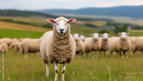 A sheep standing in a green field with a herd grazing in the background under a cloudy sky.