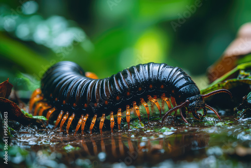 millipede, rainforest, invertebrate, arthropod, crawling, wet, damp, leaf, puddle, leg, exoskeleton, shiny, black, orange, green, blur, foliage, macro, closeup, nature, wildlife, tropical, jungle, biodiversity, segmented, insect, creeping, movement, life, ecosystem, earth, forest floor, water, detail, texture, photo, natural, vibrant, colours, vibrant color, sharpened