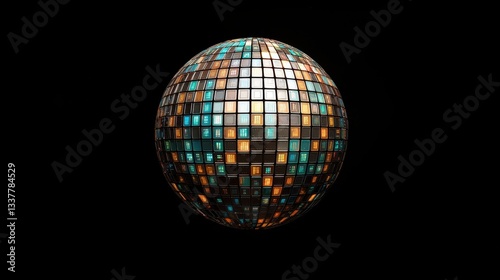 A shiny disco ball with colorful, reflective tiles against a dark background, evoking a vibrant party atmosphere.