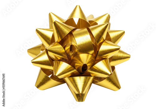 A shiny gold metallic gift bow with pointed petals sits isolated on a transparent background
