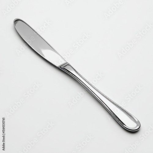 A shiny stainless steel butter knife resting on a clean white surface, ideal for culinary presentations