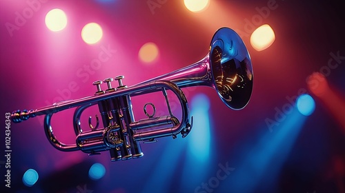 trumpet, brass, instrument, music, musical, jazz, orchestra, band, concert, stage, performance, light, spotlight, blue, purple, pink, shiny, metallic, gold, bell, mouthpiece, sound, melody, rythm, harmony, note, tune, symphony, conductor, audience, enjoyment, entertainment, professional, art, culture, passion, skill, talent, dream