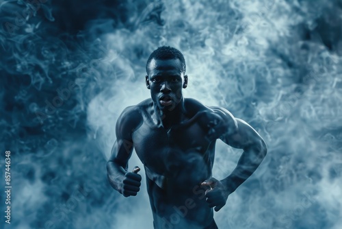 A shirtless man stands in a cloud of smoke, perfect for use in scenarios requiring dramatic or mysterious atmosphere