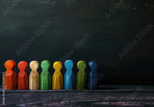 A side view of colorful wooden pegs arranged neatly on a reflective surface, creating a visually appealing diversity concept.