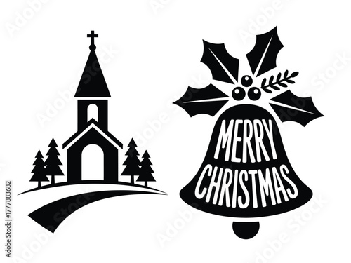 A silhouette of a church with trees and a merry Christmas bell with holly are depicted against a white background.