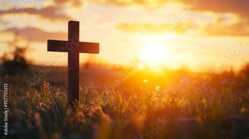 A silhouette of a cross set against a glowing sunset. The cross stands out dramatically with the sun casting a warm, golden light in the background, creating a serene and symbolic scene.