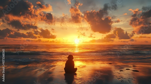 A Silhouette of a Dog Sitting Calmly on the Beach at Sunset