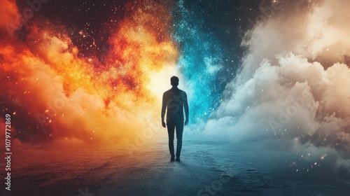choice, decision, duality, contrast, conflict, fire, ice, sky, cloud, star, galaxy, space, silhouette, man, figure, human, abstract, surreal, fantasy, dream, vision, mystical, spiritual, power, energy, light, darkness, hope, despair, future, past, journey, path, destination, perspective, imagination, creativity, art, concept, design, illustration, background