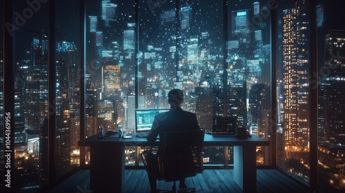A silhouette of a person at a desk, overlooking a futuristic cityscape at night.
