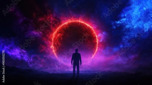 silhouette, cosmic, portal, person, racked, front, vibrant, colours, light, imagination, shadow, ambience, atmosphere, idea, contrast, design, travel, narrative, wonder, motion, scenery, galaxy, journey, mindfulness, adventure, mystical, connection, outline, fantasy, mystery, aesthetic, horizon, figure, essence, celestial, dreamscape, landscape, emotion, mystique, vision, energy, dimension, universe, aethereal, exhibit, beauty, abstract, concept