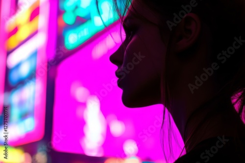 A silhouette of a person stands against vibrant neon signs in a bustling city at night, capturing urban vibrance.