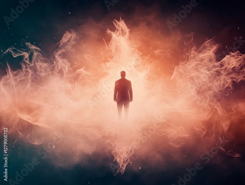 A silhouette of a person stands amidst vibrant, swirling colors of light and smoke, evoking a sense of wonder and introspection.