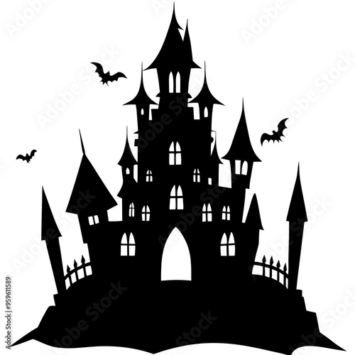 a silhouette of a spooky castle with multiple towers and pointed roofs. The castle has several windows, and there are bats flying around it