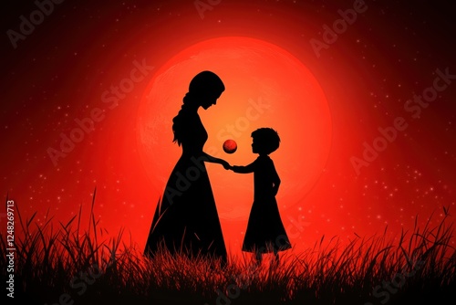 A silhouette of a woman and a child exchanging an object against a vibrant red sunset, evoking themes of connection and warmth.