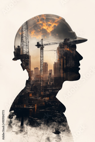 A silhouette of construction worker layered with city skyline and cranes, symbolizing connection between labor and urban development. image evokes sense of ambition and progress