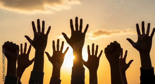 A silhouette of many hands raised in the air against a cloudy sunset sky, signifying unity and community.