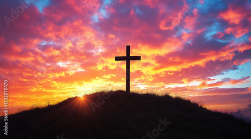 a silhouette of the cross on a hilltop against a colorful sunset sky.