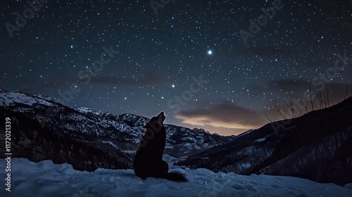 dog, night, star, mountain, snow, sky, silhouette, nature, landscape, calmness, beauty, wilderness, outdoors, calm, serene, animal, scenery, exploration, adventure, peaceful, celestial, cosmos, environment, dark, winter, moonlight, horizon, view, skyward, solitude, freedom, wildlife, quiet, atmosphere, breathtaking, stillness, nightscape, dreaming, wonder, mystique, inspiration, photo, art, gloaming