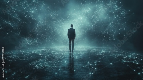 A silhouetted figure stands amidst a digital network of glowing connections and data.