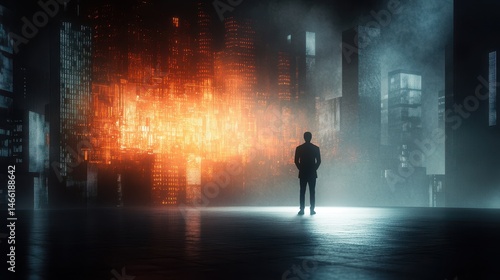 A silhouetted figure stands before a futuristic cityscape, illuminated by vibrant orange lights against a dark, smoky background.