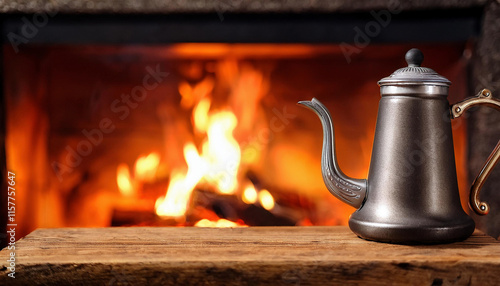 A silver teapot sits on a wooden table in front of a warm, glowing fireplace during a nostalgic night