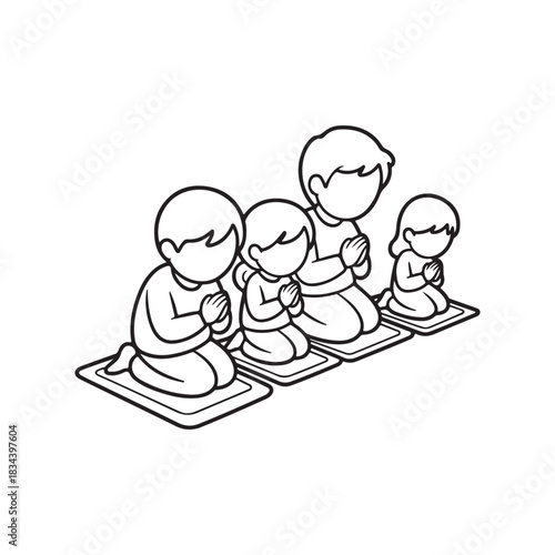 family, prayer, meditation, illustration, black-and-white, line art, kneeling, together, simple, cartoon, drawing, people, four people, religious, spiritual, devotion, worship, faith, peace, calmness, mindfulness, relaxation, contemplation, oneness, harmony, connection, support, comfort, hope, belief, tradition, culture, practice, ritual, design, graphic, vector, isolated, white background, minimalist, vignetting, outline, sitting, sharpened, inner peace, serenity