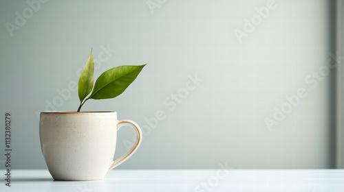 A simple, elegant cup holds fresh green leaves, symbolizing growth. The minimalist background enhances the focus on the plant, offering a calming aesthetic