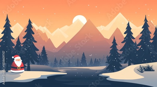 A simple, flat design showing mountains, Santa Claus, and pine trees against a sunset-colored sky. A calm river flows in the foreground.