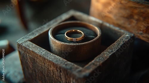A simple gold wedding band with a single diamond sits inside a wooden ring box.