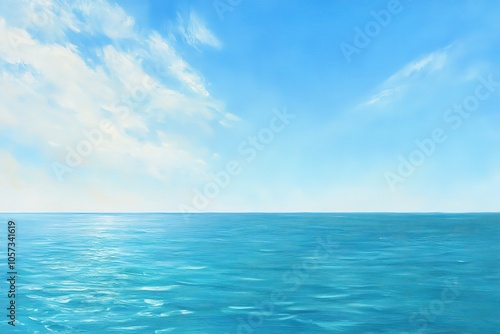 A simple oil painting of the ocean, with a horizon line and a blue sky dotted with white clouds.
