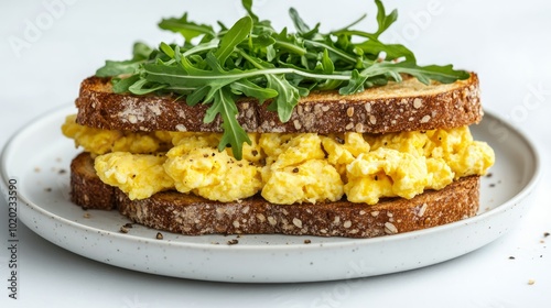 A simple sandwich with scrambled eggs and arugula on a white plate.