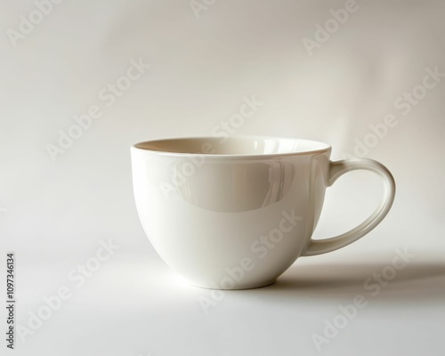 A simple white ceramic cup sits against a light background, emphasizing its smooth surface and elegant shape.