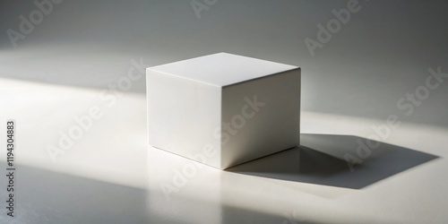 A simple white cube illuminated by sunlight casts a dramatic shadow on a minimalist surface