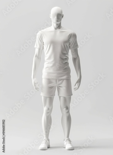A simple white mannequin in a white T-shirt and shorts