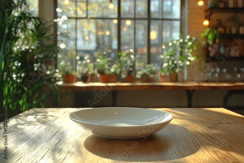 A simple white plate elegantly placed on a wooden table, illuminated by soft sunlight in a cozy, plant-filled café.