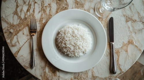 A Simple White Rice Dish Served on a Marble Table with Elegant Cutlery, Capturing the Essence of Minimalist Dining in a Contemporary Setting