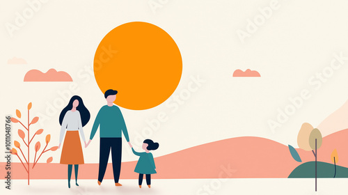 A simplified illustration of a family holding hands, walking under a large sun in a minimalistic landscape