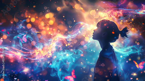 A singer performing on a mystical stage with swirling magical lights and ethereal butterflies