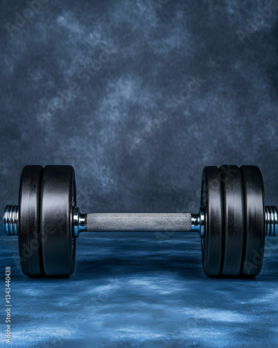 A single black dumbbell rests on a blue surface against a dark textured backdrop