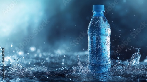 A single bottle of water with blue cap stands on a dark blue background with water splashing around it.