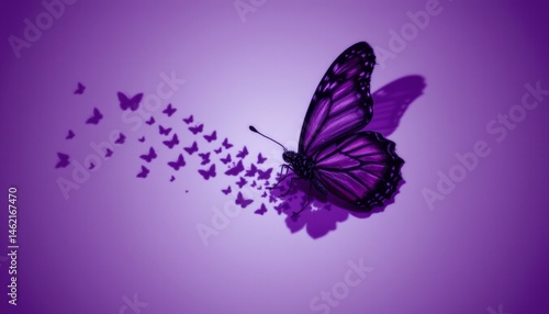 a single butterfly positioned against a clean neon purple background, part of its wings dissolving into tiny butterflies, shadow silhouette forming a blooming flower, soft glowing edges