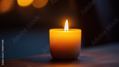 A Single Candle Burning on a Wooden Surface in a Dark Room