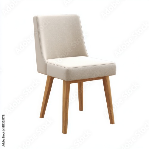 A single chair with light beige fabric upholstery and wooden legs on a white background studio shot