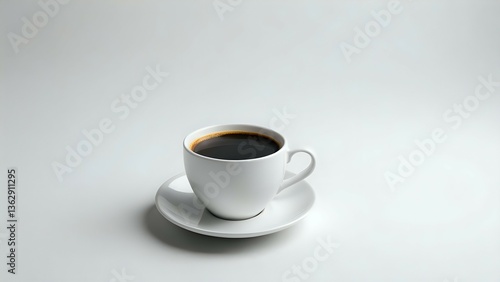 A single cup of black coffee sits on a saucer against a minimalist white background. Perfect for coffee shop menus, websites, or blogs.