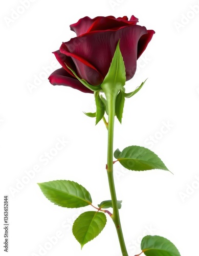 A single dark red rose with vibrant green leaves, isolated on a pure white background, vibrant, romantic, rose