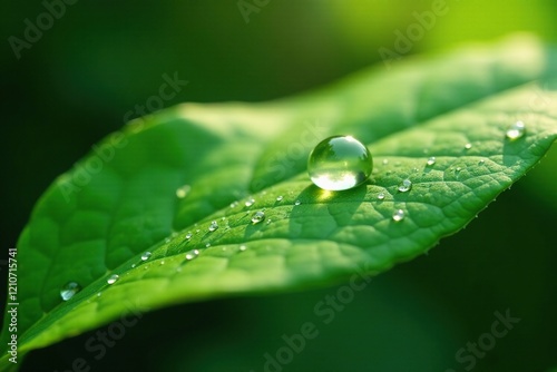 A single dewdrop glistens on the leaf's surface as sunlight touches it gently, water, gentle, delicate