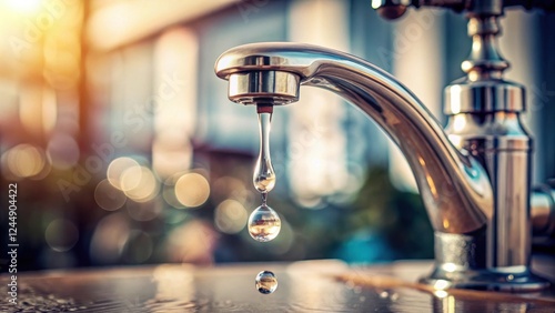 A single drop of water falls from a polished chrome faucet, reflecting the warm sunlight