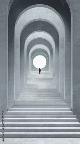 staircase, white, hallway, arched, ceiling, figure, man, suit, walk, ascend, doorway, open, circular, light, bright, perspective, architecture, modern, abstract, minimalism, simplicity, symmetric, geometric, line, shape, composition, standard, scale, interior, design, space, empty, alone, single, solitary, journey, destination, path, goal, future, hope, success, progress