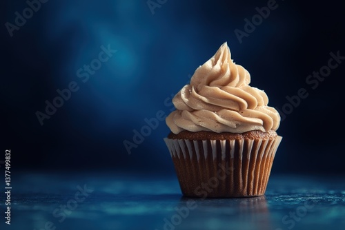 A single frosted cupcake sits alone against a blue background