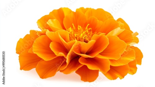 A Single Marigold Flower, Isolated, White Background, Close-up Macro Photography, Orange Petals, Delicate, Floral Beauty